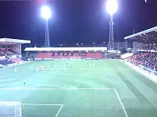 The new Main Stand, opened in August 1962, was the first in Scotland to be constructed with a cantilever roof to provide column-free viewing for spectators.[6][7] It was intended at the time that the whole ground would be re-built in a similar manner, but due to lack of finance no further building took place. This meant that the stand, which had a very tight spacing between the rows of seats, is an unusual L-shape around the south-eastern corner of the ground.[7] The stand was also the first in Scotland to have a glass fronted lounge for the benefit of sponsors.[6] This was opened in 1971 and overlooked the pitch, something that is now a common sight in football grounds across the country.