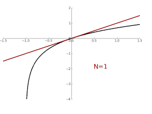 In contrast, also shown is a picture of the natural logarithm function ln(1 + x) and some of its Taylor polynomials around a = 0. These approximations converge to the function only in the region −1 < x ≤ 1; outside of this region the higher-degree Taylor polynomials are worse approximations for the function.