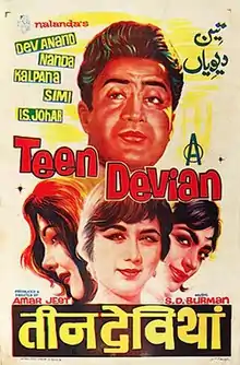 Teen Devian (transl. Three Goddesses) is a 1965 Bollywood film directed by Amarjeet, starring Dev Anand. Filmed mostly in black and white, with some colour scenes, the movie tells the story of a poet who falls in love with three different women. It is inspired by writer D.H. Lawrence's works.[1] The music was composed by S. D. Burman, whose son Rahul Dev Burman composed the English version of this film titled "Oh Boy and Three Girls", but the print was never released.[1]