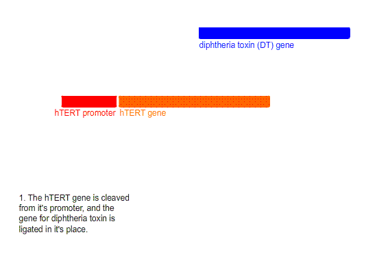 Another method that has been studied is manipulating the hTERT promoter to induce apoptosis in tumor cells. Plasmid DNA sequences can be manufactured using the hTERT promoter followed by genes encoding for specific proteins. The protein can be a toxin, an apoptotic factor, or a viral protein. Toxins such as diphtheria toxin interfere with cellular processes and eventually induce apoptosis.[45] Apoptotic death factors like FADD (Fas-Associated protein with Death Domain) can be used to force cells expressing hTERT to undergo apoptosis.[48] Viral proteins like viral thymidine kinase can be used for specific targeting of a drug.[49] By introducing a prodrug only activated by the viral enzyme, specific targeting of cells expressing hTERT can be achieved.[49] By using the hTERT promoter, only cells expressing hTERT will be affected and this allows for specific targeting of tumor cells.[45][48][49]
