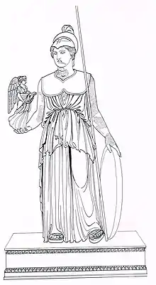 Inside the cella, there was an Athena Polias statue for dedication. However, the actual shape was unknown.[57] In ca. 158-156 BC, a sculpture, offering of Orophernes, replaced the old statue.[58][59] Tetradrachms at that time indicated this event.[60] The new statue remained of Athena but was a copy of the gold and ivory version by Phidias in Athens.[61] It was a standing statue of Athena, with calm facial expression and holding a spear and a shield, wearing a helmet.[62] The statue was 6.5 m (21 ft) tall and three times smaller than the Athenian original.[63]