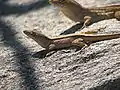 The brown anole is very invasive and reaches exceptionally high population densities. The brown anole seems to be taking over the green anole's habitats. The brown anoles have even been known to eat green anoles. |