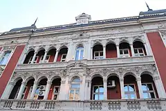 - Hotel Balkan (1935); right across the Hotel Moskva; originally a one-story building built in 1860 on the location of the Simina Kafana, opened by Sima Mehandžija in 1848.[11] It was demolished in 1935 when the present building of the hotel was constructed, work of architect Aleksandar Janković;[27] The old building was also known as the Simina mehana ("Sima's meyhane") and was the gathering point for the volunteers during the Serbian-Turkish wars;[14] Singer Zdravko Čolić recorded a song about the hotel in 2000;[27][54]