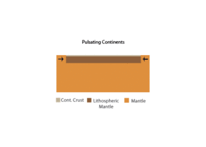 In the pulsating continents model, differentiated, low density crust survives early global subduction events forming continental regions. These regions undergo compression due to heating from the surrounding mantle, forming the compressional features of tessera, such as fold and thrust belts, and basin dome terrain. After sufficient crustal thickening has occurred, new lithosphere is generated causing gravitational collapse, producing the extensional features of tessera, such as extensive grabens. During this collapse, decompression causes partial melting, producing the intratessera volcanism seen within the larger regions of tessera terrain. This model requires that the material comprising tessera terrain is continental in nature. Future missions to venus to sample surface compositions are necessary to support this model.[9] This model does not currently explain how a global subduction event could cause the delamination of the entire mantle lithosphere, leaving only low density crust behind.