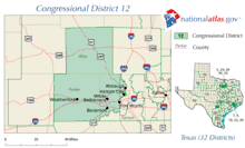 Texas's 12th congressional district in the United States House of Representatives is in the north portion of the state of Texas. As of 2017, the 12th district contained 806,551 people and had a median income of $67,703.[2] It consists of the western half of Tarrant County, as well as all of Parker County and an eastern portion of Wise County. Fragments of the Dallas–Fort Worth metroplex are included in the district. The district is currently represented by Republican Kay Granger, who was first elected in 1996.