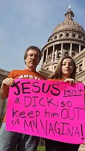 Images of the placard carried by pro-choice activists Billy Joe Cain, his daughter Tuesday, with the message "JESUS isn't a DICK; so keep him OUT of MY VAGINA!" went viral, the resultant controversy was reported nationally and internationally.[38][39][40]