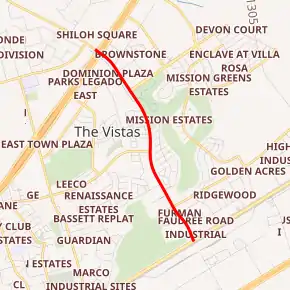 Spur 588 begins at an intersection with I-20 Business in Odessa, Midland County, heading northwest on four-lane undivided Faudree Road. The road passes between the Odessa Country Club to the west and commercial areas to the east before running between the golf course and residential neighborhoods. The highway continues past more housing subdivisions with some fields, crossing into Ector County. Spur 588 reaches its northern terminus at an interchange with SH 191.[1][2][3]