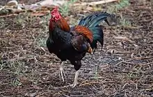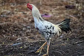 The Thai Game is a breed of hard feather fighting chicken, originating in Thailand, and known as Thai: ไก่ชน. Since 2009 they have been recognised by the British Poultry Standards. They are described as of Malayoid type, with similarities to Shamo but with a lighter build and higher positioned tail as the most obvious differences. Any colour is accepted,[1] but red black is the most common.[2]