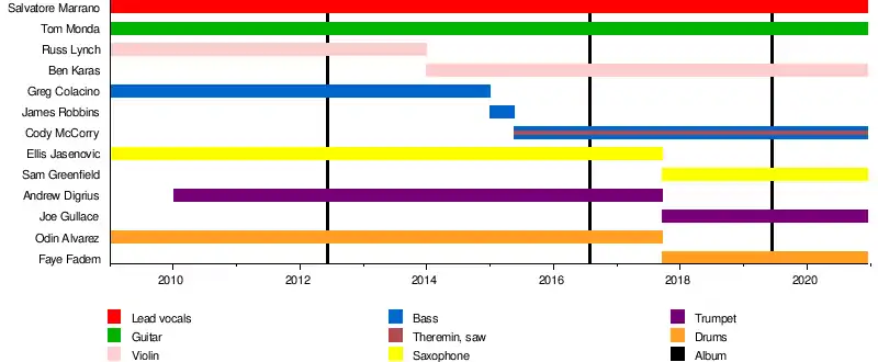 The deal opened multiple doors for the band, which soon started touring with Periphery in 2015, and with Coheed and Cambria later that year.[7] a 2015 tour with Periphery[8] Bass player Greg Colacino left the band that year, and was temporarily replaced by James Robbins and later on by Cody McCorry of Karmic Juggernaut.[9] Touring put new pressure on the band, which announced on September 2017 that Odin Alvarez, Ellis Jasenovic, and Andrew Digrius would leave the band, and were to be replaced by Faye Fadem on drums, Sam Greenfield on sax, and Joe Gullace on trumpet.[10] In 2017 their song "Psychopomp" was included in Bluecoats Drum and Bugle Corps show "Jagged Line".