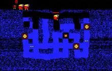 Scattered in the mine are three trapped miners, represented by frowny faces in a red box. When Robby digs them out, they turn into smileys and begin to follow him as he moves. The goal of each level is to return the trapped miners to the surface, and only one path, at the top center or the map, leads outward. At higher levels, a door closes behind Robby after he enters, and must be opened by retrieving a key before the level can be completed.