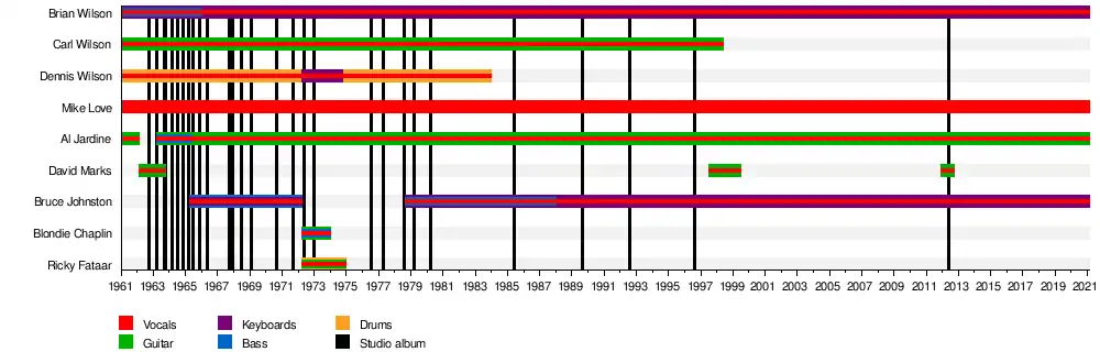 ![]() The Beach Boys during their 2012 reunion. From left: Brian Wilson, David Marks, Mike Love, Bruce Johnston, Al Jardine. | |