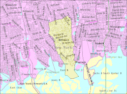 Bellmore is a hamlet and census-designated place (CDP) in Nassau County, New York, United States. The population according to the 2010 census was 16,218. Bellmore is located on the south shore of Long Island 5 miles from Jones Beach State Park, approximately 27 miles (43 km) east of Manhattan, and 10 miles (16 km) east of the Nassau-Queens (New York City) Line. North Bellmore is a census-designated place (CDP) in Nassau County, New York, United States. The population was 19,941 at the 2010 census.