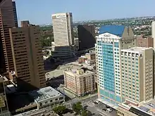 The Bow is a 158,000-square-metre (1,700,000 sq ft) office building in downtown Calgary, Alberta, which was the headquarters of oil and gas companies Encana (now Ovintiv) and Cenovus. The 236 metre (774 ft) building is currently the second tallest office tower in Calgary, since construction of Cenovus' Brookfield Place; and the third tallest in Canada outside Toronto.[3] The Bow is also considered the start of redevelopment in Calgary's Downtown East Village.[4] It was completed in 2012 and was ranked among the top 10 architectural projects in the world of that year according to Azure magazine.[5]