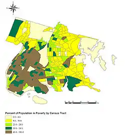 In the 1970s, parts of the Bronx were plagued by a wave of arson. The burning of buildings was predominantly in the poorest communities, such as the South Bronx. One explanation of what occurred was that landlords decided to burn their low property-value buildings and take the insurance money, as it was more lucrative to get insurance money than to refurbish or sell a building in a severely distressed area.[58] The Bronx became identified with a high rate of poverty and unemployment, which was mainly a persistent problem in the South Bronx.[59] There were also cases where tenants burnt themselves out of their apts/buildings to qualify themselves for emergency relocations by City social service agencies to better lodgings.