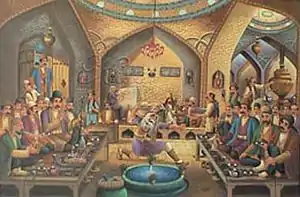 In cities, towns, and villages of Iranian Azerbaijan ashiks entertain audiences in coffeehouses.[2] According to İlhan Başgöz, in late 1960s coffeehouses dedicated for ashik performance were located in major urban centers and their customers consisted of peasants or tribesmen who came to city for some business.[1] The most famous among these coffeehouses was the "Coffeehouse of Husein Tirandaz" in Tabriz. Since early 1970s leftist intellectuals frequented this particular coffeehouse and, by mid 1970s, transformed it to the focal point of student movement.[3][4]