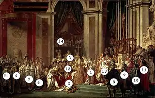 The Coronation of Napoleon[lower-alpha 1] (French: Le Sacre de Napoléon) is a painting completed in 1807 by Jacques-Louis David, the official painter of Napoleon, depicting the coronation of Napoleon I at Notre-Dame de Paris. The painting has imposing dimensions, as it is almost 10 metres (33 ft) wide by a little over 6 metres (20 ft) tall and was completed in the medium of oil painting. The work is on display at the Louvre Museum in Paris.
