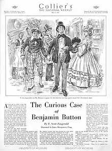 "The Curious Case of Benjamin Button" is a short story written by F. Scott Fitzgerald. First published in Collier's Magazine on May 27, 1922 with the cover and illustrations by James Montgomery Flagg. It was subsequently anthologized in Fitzgerald's book Tales of the Jazz Age, which is occasionally published as The Curious Case of Benjamin Button and Other Jazz Age Stories.[1]