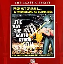 The Day the Earth Stood Still received recognition from the American Film Institute and was selected for preservation in the United States Library of Congress' National Film Registry. In 2001, it was ranked number 82 on 100 Years ... 100 Thrills, a list of America's most heart-pounding films.[28] It placed number 67 on a similar list 100 Years ... 100 Cheers, a list of America's most inspiring films.[29] In June 2008, the American Film Institute revealed its "10 Top 10" – the best ten films in ten "classic" American film genres – after polling more than 1,500 people from the creative community. The Day the Earth Stood Still was acknowledged as the fifth best film in the science fiction genre.[30] The film was also on the ballot for AFI's other lists including 100 Years ... 100 Movies,[31] the tenth anniversary list,[32] 100 Years ... 100 Heroes and Villains for Klaatu in the heroes category,[33] 100 Years ... 100 Movie Quotes for the famous line "Gort! Klaatu barada nikto"[34] and AFI's 100 Years of Film Scores.[35] In 2004, the film was selected by The New York Times as one of The Best 1000 Movies Ever Made.[36]