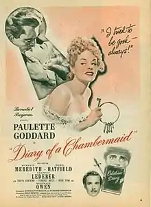 The Diary of a Chambermaid (1946) is a drama film about a newly hired servant who severely disrupts a wealthy family. The film was based on the 1900 novel of the same name by Octave Mirbeau and the play Le journal d'une femme de Chambre, written by André de Lorde, with André Heuse and Thielly Nores. The film was directed by Jean Renoir, and starred Paulette Goddard, Burgess Meredith, Hurd Hatfield, and Francis Lederer. It was named the eighth best English-language film of 1946 by the National Board of Review.[1]