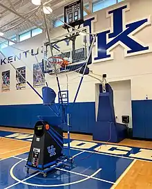 The Gun was invented by John Joseph in 1998, although the first basketball Gun was not purchased until 1999 by the University of Florida. As of 2020, almost 28,000 basketball Guns are being used by high schools, colleges, and the NBA.[3] Joseph had previously invented a non-automated rebounding device known as the "Shoot-A-Way,"[4] for which he filed a patent for in 1984.[5] Like the Shoot-A-Way, the Gun has a "collection net [that] can be adjusted from 11 feet to 14 feet to force players to shoot with the right amount of arch depending on where they are shooting from."[6] Although unlike the Shoot-A-Way, which used tracks to return the ball to the player, the Gun returns the ball by shooting the ball back to the player at a previously set speed and time, this function allows for the player to take up to 1800 shots every hour.[6] This function also allows for a ball to be passed every two seconds, which allows a player to take 200 shots in 10 minutes.[7] Currently there are two models of the basketball Gun invented by John Joseph; the Gun 6000 and the Gun 8000.