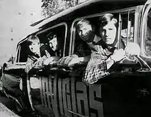 The initial lineup consisted of the leader Gross on guitar and vocals, Bruce Hickey on guitar, and Dave Hickey on drums.[2] In 1961, while Gross was attending the Rochester Institute of Technology, he expanded the band to include Jim Kohler on bass and Mark Blumenfeld on lead guitar. The band renamed themselves the Invictas.[2] The name was inspired by the Buick car of the time known as the Invicta, meaning "invincible" in Latin.[2] The Invictas, who used a black hearse with their band logo painted on the side to haul equipment and travel from gig to gig, became a regular fixture at Tiny's Bengal Inn, a local club.[1]