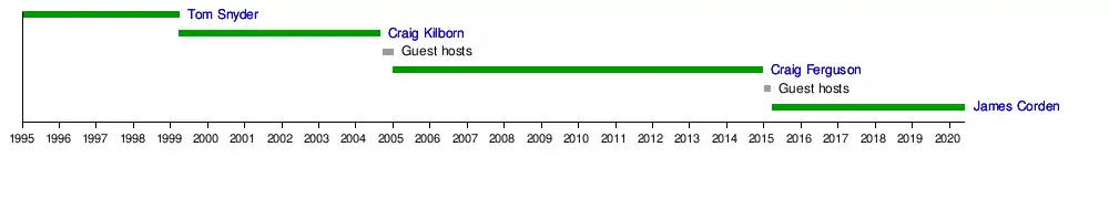 The Late Late Show is an American late-night television talk and variety comedy show on CBS. It first aired in January 1995, with host Tom Snyder, who was followed by Craig Kilborn, Craig Ferguson, and current host James Corden. The show originates from Television City in Los Angeles.