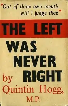 The Left Was Never Right was a book published in June 1945 by Quintin Hogg, the Conservative MP for Oxford, which examined the speeches and policies of politicians from the Labour Party and the Liberal Party concerning armaments and appeasement. These were contrasted to quotes by Conservative MPs such as Winston Churchill and Sir Austen Chamberlain supporting British rearmament and against appeasement of Germany. The books dust-jacket quoted Jesus' remark: "Out of thine own mouth will I judge thee" from Luke 19:22.