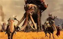 The graphics and animations of the game were considered substandard. GamesRadar+ chastised the game as presenting "a band of wooden-legged freaks who moonwalk like the Former King of Pop [...] the gimpiest horses since Two Worlds," and likened some of the creature character models to "claymation diarrhea."[19] IGN stated that "friend and foe alike blend into one messy brown blur".[20] GameSpy called the graphics "lackluster" and the environments "bland", feeling that the backgrounds were lacking in detail.[18] Some reviewers also complained about the lack of enemies on screen, CVG saying that the "cardboard cut-outs in the background" were the most exciting part of a battle.[15][22]