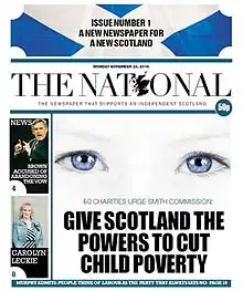 The first edition of The National carried the headline "Give Scotland the powers to cut child poverty", an article in which charities urged the Smith Commission to devolve welfare powers to the Scottish Parliament.[35] The newspaper also included a mixture of national and international stories, with Libby Brooks of The Guardian noting the international coverage was "[stronger] than one is used to from a Scottish title [with] stories from Tunisia and Gaza as well as a profile of [Iranian President] Hassan Rouhani".[12] There was also sport and business coverage, but the BBC's Jamie McIvor wrote of the first edition that "stories related to independence, Scottish politics and issues which featured in the referendum campaign characterise the news pages".[9] The newspaper's opening edition also set out its mission statement: