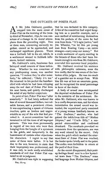The story takes place in a Californian community known as Poker Flat, near the town of La Porte. Poker Flat is, in the opinions of many, on a downward slope. The town has lost thousands of dollars, and has experienced a moral decline. In an effort to save what is left of the town and reestablish it as a "virtuous" place, a secret society is created to decide whom to exile and whom to kill. On November 23rd of 1850, four "immoral" individuals are exiled from Poker Flat and warned not to return on pain of death. The first of them is a professional poker player, John Oakhurst. He is among those sent away because of his great success in winning from those on the secret committee. On his way out of town, he is joined by two women, the Duchess and Mother Shipton, and Uncle Billy, the town drunk and a suspected robber. These four set out for the Sandy Bar mining camp, a day's journey away over a mountain range. At noon, the group stops for a rest over Oakhurst's protests.
