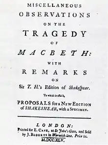 Johnson began work on Macbeth to provide a sample of what he thought could be achieved in a new edition of Shakespeare.[7] He got much of his information while working on the Harleian Catalogue, a catalogue of the collection of works and pamphlets owned by Robert Harley, 1st Earl of Oxford and Earl Mortimer.[7] He published this work, along with a commentary on Sir Thomas Hanmer, 4th Baronet's edition of Shakespeare's plays, as Miscellaneous Observations or Miscellaneous Observations on the Tragedy of Macbeth on 6 April 1745 by Edward Cave.[7]