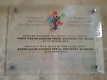 The President's Foundation for the Wellbeing of Society (Maltese: Il-Fondazzjoni Tal-President Għall-Ġid tas-Soċjetà)[1] is a non-governmental organisation located in Malta, focusing on social research, community consultation, and project work. The Foundation was established on 25 June 2014 by Marie-Louise Coleiro Preca, during her term as the 9th President of Malta.