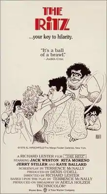 The Ritz is a 1976 British-American comedy farce film directed by Richard Lester based on the 1975 play of the same title by Terrence McNally. Actress Rita Moreno, who had won a Tony Award for her performance as Googie Gomez in the Broadway production, and many others from the 1975 original cast, such as Jack Weston, Jerry Stiller, and F. Murray Abraham, reprised their stage roles in the film version. Also in the cast were Kaye Ballard and Treat Williams. The film, Jack Weston, and Rita Moreno all received Golden Globe nominations in the comedy category. It opened to mixed reviews.