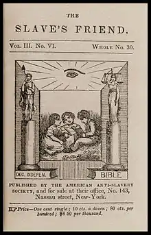 In 1836 the first issue of the children's magazine of the AASS, The Slave's Friend, saw print.[1] With a view to producing a periodical that could be comfortably handled by diminutive readers, a small physical format was used for the magazine.[2] A readership ranging in age from 6 to 12 appears to have been targeted by the editors.[2]
