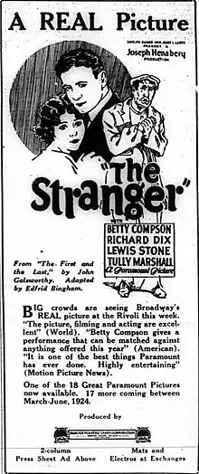 The Stranger is a 1924 American silent drama film directed by Joseph Henabery and starring Betty Compson and Richard Dix. It is based on a 1918 novel, The First and the Last, by John Galsworthy. It was produced by Famous Players-Lasky and distributed through Paramount Pictures.[1]