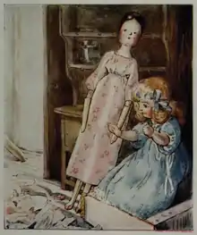 On February 25 Warne sent plaster food and miniature furniture from Hamleys, a London toy shop.[8][9] On April 20 the photographs of the doll's house were delivered, and at the end of May Potter wrote to Warne that eighteen of the mouse drawings were complete, and the remainder were in progress. By the middle of June proofs of the text had arrived, and after a few corrections, Potter wrote on June 28 that she was satisfied with the alterations. Proofs of the illustrations were delivered, and Potter was satisfied with them.[10] In September 1904 20,000 copies of the book were published in two different bindings – one in paper boards and the other in a deluxe binding designed by Potter. The book was dedicated to Winifred Warne, "the girl who had the doll's house".[11][12]