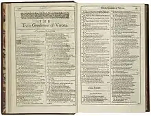 Language is of primary importance in the play insofar as Valentine and Proteus speak in blank verse, but Launce and Speed speak (for the most part) in prose.[38] More specifically, the actual content of many of the speeches serve to illustrate the pompousness of Valentine and Proteus' exalted outlook, and the more realistic and practical outlook of the servants. This is most apparent in Act 3, Scene 1. Valentine has just given a lengthy speech lamenting his banishment and musing on how he cannot possibly survive without Silvia; "Except I be by Silvia in the night/There is no music in the nightingale./Unless I look on Silvia in the day/There is no day for me to look upon" (ll.178–181). However, when Launce enters only a few lines later, he announces that he too is in love, and proceeds to outline, along with Speed, all of his betrothed's positives ("She brews good ale"; "She can knit"; "She can wash and scour"), and negatives ("She hath a sweet mouth"; "She doth talk in her sleep"; "She is slow in words"). After weighing his options, Launce decides that the woman's most important quality is that "she hath more hair than wit, and more faults than hairs, and more wealth than faults" (ll.343–344). He announces that her wealth "makes the faults gracious" (l.356), and chooses for that reason to wed her. This purely materialistic reasoning, as revealed in the form of language, is in stark contrast to the more spiritual and idealised love espoused by Valentine earlier in the scene.[39]
