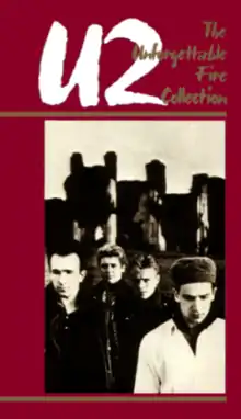 The Unforgettable Fire was released on 1 October 1984. The album took its name and much of its inspiration from a Japanese travelling exhibition of paintings and drawings at The Peace Museum in Chicago by survivors of the atomic bombs at Hiroshima and Nagasaki, Japan.[18][36] The band spent a few days driving around Ireland with photographer Anton Corbijn looking for potential locations. The castle depicted on the cover is Moydrum Castle.[9] The band liked the image's ambiguity and the Irish mysticism they saw in it. The photograph, however, was a virtual copy of a picture on the cover of a 1980 book In Ruins: The Once Great Houses of Ireland by Simon Marsden. It was taken from the same spot and used the same solarised filter technique, but with the addition of the four band members. For this copyright infringement, the band had to pay an unknown sum to the photographer.[30]