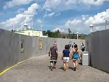 A completely functioning full-scale replica of the Hogwarts Express was created for the Diagon Alley expansion, connecting King's Cross Station at Universal Studios to the Hogsmeade station at Islands of Adventure,[48][69] manufactured by Doppelmayr Garaventa Group in the form of a funicular railway people mover.[70] The Hogwarts Express King's Cross Station features a wall between Platforms 9 and 10, where guests can "walk through" to get to Platform 9 3⁄4, like in the first film.[71]