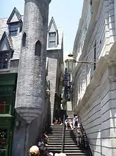The second phase was initially announced on December 6, 2011, as a significant expansion of the existing Wizarding World of Harry Potter. On May 8, 2013, it was officially announced that a substantial portion of phase two would be constructed in the adjacent Universal Studios Florida theme park with a full scale working replica of the Hogwarts Express taking guests between the two lands. This phase's flagship ride is Harry Potter and the Escape from Gringotts, a 3D dark ride/simulator based on Gringotts Bank, the wizarding bank that appears in the book and film series. Its design is similar to Transformers: The Ride and the Amazing Adventures of Spider-Man rides but built on a roller coaster track. The remaining features are themed around London and Diagon Alley. Diagon Alley officially opened on July 8, 2014.[5][6][7]