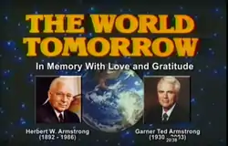 The World Tomorrow is a radio and television half-hour program which had been sponsored by the Radio Church of God (later renamed the Worldwide Church of God (WCG), under the direction of Herbert W. Armstrong). It originally ran from 1934 to 1994.[1] A 15-minute version of the radio program (under varied translations of The World Tomorrow) was broadcast in the French, German, Italian, Russian, and Spanish languages. In 2004, a new version of The World Tomorrow television program began production.