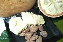 Cupuaçu butter is a triglyceride composed of saturated and unsaturated fatty acids, giving the butter a low melting point (approximately 30 °C) and texture of a soft solid, lending its use as a confectionery resembling white chocolate.[1] Main fatty acid components of cupuaçu butter are stearic acid (38%), oleic acid (38%), palmitic acid (11%) and arachidic acid (7%).[19][18]