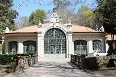 On 5 March 1904, the Viscount of Peso solicited permission to explore the mineral water springs on her property. Yet, on 11 November 1904, a dispatch delivered to the Empresa Santos, Sobral & Co. a reserved perimeter of 15 hectares for the exploration of mineral springs, allowing the company to begin its expansion.[1] These surveys were concluded in August 1906: by 1907, the flow of mineral water had expanded from 2,482 litres (656 US gal) per day (1904) to 8,000 litres (2,100 US gal) per day. The company decided to construct a pavilion in order to substitute the pump room that existed.[1] This work, begun in 1909, was under the direction of engineer Couto dos Santos, for a cost of 43 contos, with testing of the water undertaken by professor Charles Lepierre and Dr. António Cruz Magalhães.[1]