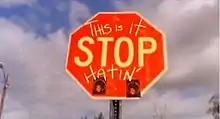 The video opens with a clip of a poster in Gary pointing fans toward Jackson's childhood home, at the corner of 2300 Jackson Street and Jackson Family Boulevard and the sound of a vintage recording of one of Jackson's siblings yelling "Michael" repeatedly.[38] An image, that is shown several times during the video, shows a one-way traffic sign near Jackson's old house that is covered in graffiti honoring Jackson, including "we luv yuh Michael."[38] Images, shown as a slide-show, of Jackson performing as a child are mixed in with shots of play sets, baseball bats and Gary's gritty industrial skyline.[38] A central image captured by Lee is a 'plea' for tolerance etched onto a stop sign in Gary, where someone had written the message "This Is It" above the word "Stop" under which they've added "hatin'."[38] Interspersed is archival footage of Jackson throughout his career and of him greeting his fans in various parts of the world. There are also shots of the musician's fans paying tribute in their own Jackson memorabilia to him following his death. At one point in the video, one of the lyrics from the song, "I never heard a single word about you," floats up out of the concrete, fading into two more shots of fan tributes from around the world and multiple flowers and messages laid at the gates of Jackson's Neverland Ranch. The video, several times, shows a single red balloon floating in the air and empty swings swaying in the breeze.[38] Towards the end of the video, there is footage of Jackson doing one of his signature dance moves, the moonwalk. It ends with footage of a black stool with Jackson's trademark black fedora and silver glove on top of it under a spotlight in front of his family's Gary residence at night.[38][41]