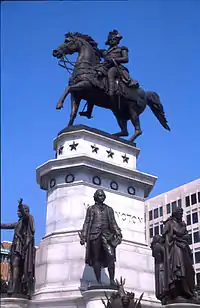 In 1849, while on a visit to this country, he received from the state of Virginia an order for a monument to be erected in Richmond. He immediately returned to Rome and began the work, of which the design was a star of five rays, each one of these bearing a statue of some historic Virginian, Patrick Henry and Thomas Jefferson among the number. The work is surmounted by a plinth, on which stands an equestrian statue of George Washington. These statues, modeled in Rome, were cast at a Munich foundry.[4]