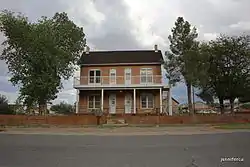 Thomas Leavitt built a two-story brick home in Bunkerville for his first wife Louella (Abbott). Then Leavitt subsequently married a second wife Ada (Waite).[5] The prosperous Leavitt, who had thrived growing grain, raising cattle and selling molasses, built another home for the family. The T-shaped house, two stories high and one room deep, had chimneys at each end. The design was typical of the homes of Mormon settlers dispersing from Salt Lake northward to Idaho and southward towards Nevada. The house featured multiple exterior doors, which in a Mormon polygamist community meant that the house would allow circulation while allowing some interior privacy. The house had no hallways, and was surrounded by large wooden porches on the exterior.