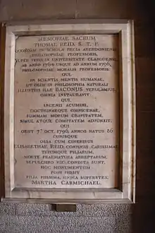 Memoriae sacrum THOMAE REID, S.T.P., quondam in Schola Regia Aberdonensi Philosophiae Professoris; nuper vero, in Universitate Glasguensi, ab anno 1764 usque ad annum 1796, Phi1osophiae Moralis Professoris; qui in Scientia Mentis Humanae, ut olim in Philosophia Naturali illustris ille Baconus Verulamius, omnia instauravit; qui ingenii acumini, doctrinaeque omnigenae, summam morum gravitatem, simul atque comitatem, adjunxit; qui obiit 7th October, 1796, annos natus 86. Cujusque ossa cum cineribus ELIZABETHAE REID, conjugis carissimae, triumque filiarum, morte praematura abreptarum, sepulchro hic condita sunt, hoc Monumentum poni jussit filia piissima, unica superstes, Martha Carmichael."[2]