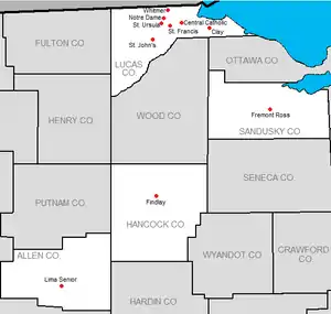 The Three Rivers Athletic Conference is an Ohio High School Athletic Association (OHSAA) high school athletic conference that began athletic competition in 2011 and has 10 high schools from Northwest Ohio, seven of which are from the Toledo metropolitan area, and one each from the cities of Findlay, Fremont and Lima.[1] Ken Myers, former director of public safety and public services in Fremont, is the league's inaugural commissioner.[2] The three rivers from which the conference derives its name are the Maumee, Sandusky, and Blanchard.