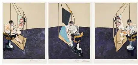 The triptych is similar to contemporary works by Bacon, including his 1969 triptych Three Studies of Lucian Freud, and has been described as an "explicit homage" to Degas's 1890s painting After the Bath, Woman Drying Herself, held by the National Gallery, London.[4] Each panel measures 198 centimetres (78 in) by 147.5 centimetres (58.1 in). The triptych is held by the Kunsthaus Zürich.[5]