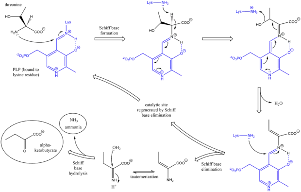 The mechanism of threonine ammonia-lyase is analogous to other deaminating PLP enzymes in its use of Schiff base intermediates.[7] Initially, the amine group of threonine attacks the lysine/PLP Schiff base, displacing lysine. After deprotonation of the amino acid alpha carbon and subsequent dehydration (hence the common name threonine dehydratase), a new Schiff base is formed. This Schiff base is replaced by lysine attack, reforming the catalytically active PLP and releasing an initial alkene-containing product. This product tautomerizes, and after hydrolysis of the Schiff base, the final products are generated.[8][9] After the final alpha-ketobutyrate product is generated, isoleucine is synthesized by progressing through the intermediates alpha-acetohydroxybutyrate to alpha-beta-dihydroxy-beta-methylvalerate, then to alpha-keto-beta-methylvalerate.[10]